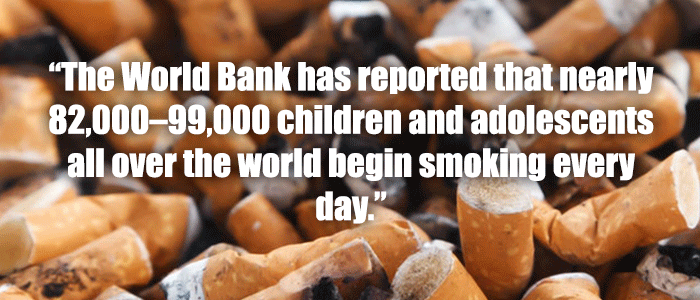The World Bank has reported that nearly 82,000–99,000 children and adolescents all over the world begin smoking every day. About half of them would continue to smoke to adulthood and half of the adult smokers are expected to die prematurely due to smoking related diseases. If current smoking trends continue, tobacco will kill nearly 250 million of today's children.